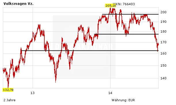 Trotz des schwachen Chartbilds sollte die VW-Aktie das Schlimmste hinter sich haben. Das Sparprogramm von Konzernchef Martin Winterkorn sollte helfen, die Rendite-Ziele für 2018 zu erreichen. Auf lange Sicht ist Volkswagen nach wie vor gut auf dem Automarkt aufgestellt. Die Aktie bleibt derzeit eine Halteposition.