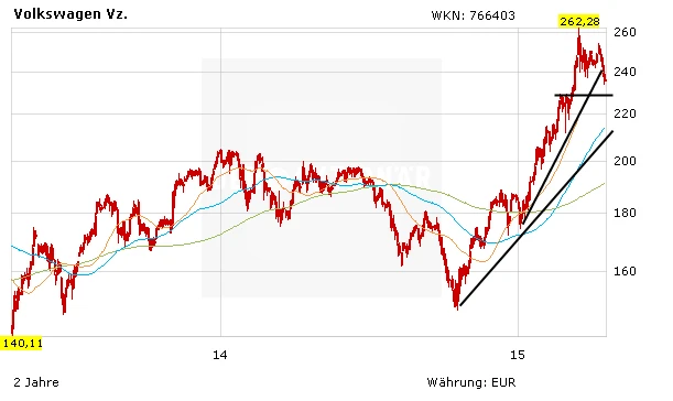 Die Verunsicherung ist raus: Winterkorn bleibt Vorstand von VW. Durhc sein Manöver hat sich vielleicht sogar Ferdinand Piech selber ins Aus katapultiert. Was die Aktie betrifft, so ist die Verunsicherung raus. Jetzt gilt es für die Führungsmannschaft, die Rendite in den kommenden Jahren nach oben zu treiben. Das wird auch die Aktie weiter beflügeln. Investierte Anleger bleiben dabei und lassen sich von den Tagesschwankungen nicht aus der Ruhe bringen. Das Papier trifft zwischen 225 und 230 auf eine Unterstützungszone.