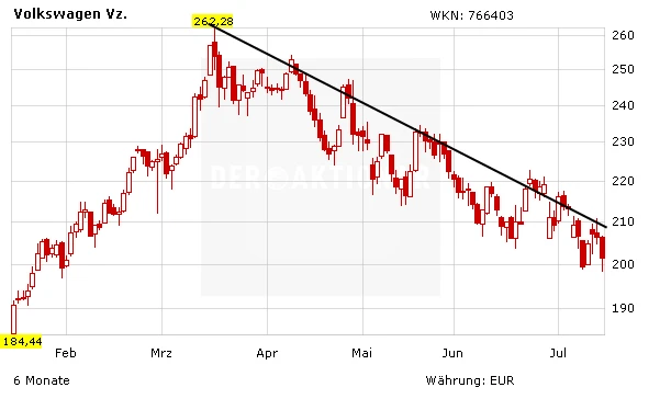 Die VW-Aktie steht in den letzten Tagen ganz besonders unter Druck. Trotz freundlicher Marktstimmung kommt das Papier nicht auf die Beine. Am Mittwoch fiel das Papier sogar unter die Marke von 200 Euro. Da half auch eine positive Analysteneinschätzung nichts: Die Baader Bank hat die Einstufung für Volkswagen vor den Zahlen auf "Buy" mit einem Kursziel von 280 Euro belassen. Volkswagen und Daimler dürften für das zweite Quartal gute Ergebnisse vorlegen, schrieb Analyst Klaus. Deswegen bevorzuge er diese beiden Autobauer vor BMW. Die Unternehmen dürften ihre Ziele für das laufende Geschäftsjahr bestätigen, aber ihre Annahmen für das Absatzwachstum in China senken.