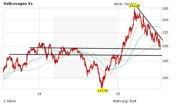 DER AKTIONÄR sah zuletzt Daimler und VW auf der Kaufliste. Es bleibt dabei: Daimler ist gut in der Spur und konnte in China zuletzt sogar zulegen. VW wird aufgrund der China-Problematik auf halten gesetzt. Das Ppaier sollte allerdings im Bereich von 195 Euro einen Boden finden. Hier liegen mehrere starke Unterstützungen. Sollten diese nicht halten, liegt das nächste Ziel bei 185 Euro.