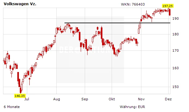 Langfristig sollte die VW-Aktie aber ihren Aufwärtstrend fortsetzen. Das Mammut-Investitionsprogramm von bis zu 100 Milliarden Euro bis zum Jahr 2018 sollte auf jeden Fall Früchte tragen. Für die Aktie ergibt sich kurzfristig allerdings erst wieder bei einem Ausbruch über die Marke von 200 Euro neues Potenzial. Investierte Anleger bleiben dabei.