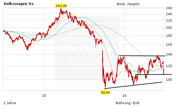 Am Freitag kam die VW-Aktie deutlich unter Druck. Bis auf 109 Euro kippte das Papier ab. Es bleibt dabei: DER AKTIONÄR geht davon aus, dass sich VW mit den US-Behörden einigen wird. Das Schlimmste sollte im Kurs eingepreist sein, und VW hat mit der Strategie 2025 die Grundlage für die Neuausrichtung gelegt. Für Anleger könnte sich aktuell eine interessante Kaufchance ergeben. Bei 116,70 Euro verläuft die 200-Tage-Linie. Darüber hat das Papier wieder Luft nach oben. Sollte der Markt aber noch einmal deutlich nachgeben, legen Anleger ein Kauflimit bei 108,10 Euro in den Markt, hier verläuft eine stärkere Unterstützung.