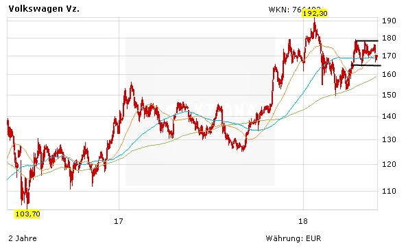 Irgendwann sollte auch der letzte an der Börse verstanden haben, dass der Abgas-Skandal von VW längst abgehakt ist. Die VW-Aktie hat sich seit Bekanntwerden des Diesel-Dilemmas und den knackigen Rücksetzer im September 2015 bis auf 86,36 Euro fast verdoppelt. Im Nachhinein war der Dieselskandal für VW vielleicht sogar gut. Die Führungsetage wurde nahezu komplett umgekrempelt und VW bekommt einen grünen Anstrich. Neu-Vorstand Herbert Diess wird die komplette Flotte elektrifizieren. 2019 beginnt in Zwickau die Produktion der VW-Elektroauto-„Familie“ I.D. Tochter Audi bringt seinen E-Tron SUV Ende 2018, Porsches Mission E wird 2020 in die Verkaufsstores kommen.