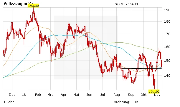 Nachdem die VW-Aktie wieder unter die 200-Tage-Line gerutscht ist, gilt es, zumindest die 90-Tage-Line zu verteidigen. Diese liegt aktuell bei 144,90 Euro. Der Stoppkurs wird auf 139 Euro angepasst.