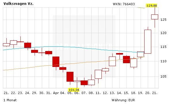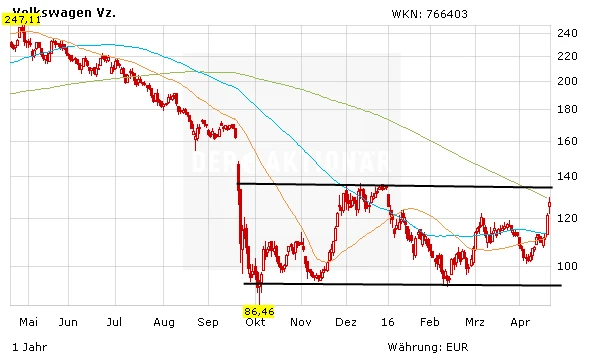 Wird jetzt die 200-Tage-Linie bei rund 130 Euro geknackt, hat die VW-Aktie aus technischer Sicht durchaus Potenzial bis in den Bereich um 138 Euro vorzudringen. Hier wartet ein hartnäckiger horizontaler Widerstand aus den Monaten Dezember 2015 und Januar 2016.