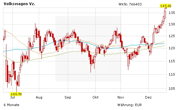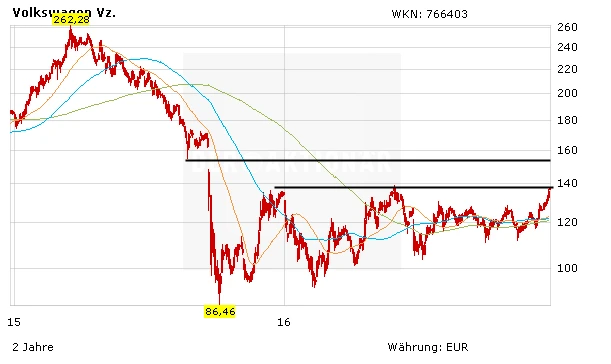 Die VW-Aktie hat sich bereits in den letzten Tagen deutlich erholt, wobei das Papier nicht ganz so stark zulegen konnte wie BMW oder Daimler. Mit dem überwinden der horizontalen Widerstandslinie bei 128 Euro hat die VW-Aktie zudem ein neues Kaufsignal signalisiert. Wird auch das Hoch aus dem Monat Mai 2016 bei 138 Euro aus dem Markt genommen, wäre der Weg sogar bis knapp 150 Euro frei.