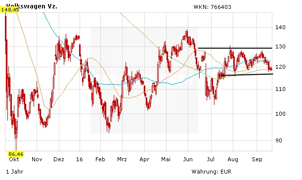 Die Autoshow in Paris verspricht jede Menge Spannung! Neben VW werden auch Daimler und BMW mit neuen Elektroflitzern aufwarten. DER AKTIONÄR bleibt bei seiner optimistischen Haltung für die VW-Papiere. Zuletzt hat sich der Autobauer bei Navistar eingekauft. Die Kooperation mit JAC macht Sinn. Die Stellung in China wird weiter ausgebaut. Bei 118,47 Euro erhält das Papier Unterstützung von der 200-Tage-Linie. Zwischen 115 Euro und 120 Euro können Anleger einen Fuß in die Tür stellen oder die Position ausbauen. Auf Sicht von zwölf Monaten weist die Aktie ein gutes Chance-Risiko-Verhältnis auf.
