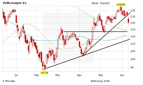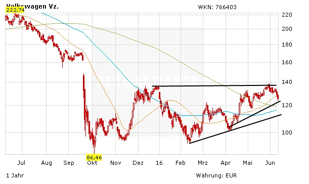 Die VW-Aktie hat in den letzten Tagen wieder etwas eingebüßt. Dennoch: Das Papier bleibt spannend. Der Aufwärtstrend ist intakt. Für mutige Anleger bietet der Rücksetzer eine interessante Einstiegschance. Der Stoppkurs liegt bei 110 Euro.