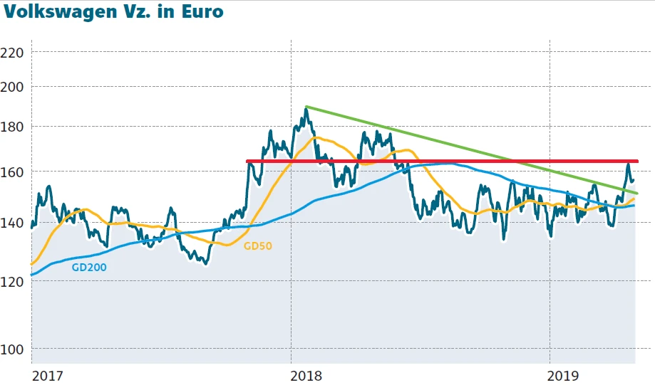 Technisch bleibt es dabei: Nach dem Ausbruch über die Marke von 155,60 Euro ist die VW-Aktie bis 164,00 Euro gelaufen und damit knapp bis an den starken horizontalen Widerstand bei 165,00 Euro. Derzeit läuft die Konsolidierung. Idealerweise geht diese bis auf das Ausbruchsniveau bei 156,00 Euro. Sollte diese Marke fallen, liegt das nächste Unterstützungsniveau bei 152,50 Euro. Im Anschluss sollte die Aktie mit einem freundlichen Gesamtmarkt im Rücken wieder Fahrt aufnehmen. Nach dem Break der Marke von 165,00 Euro hätte die Aktie Luft bis 178,00 Euro