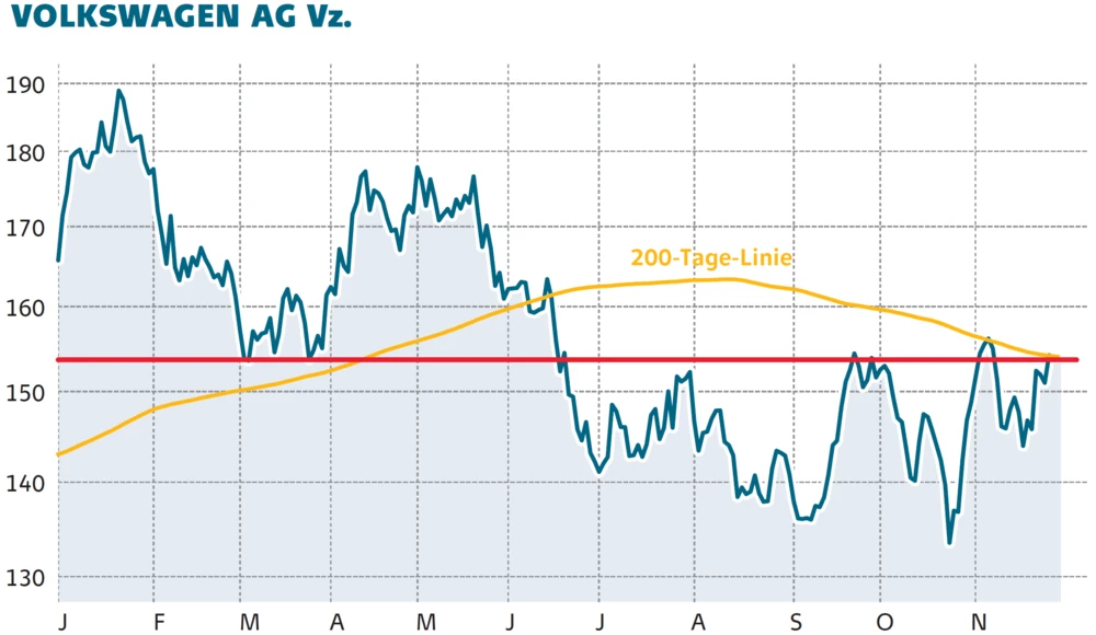 In den letzten Tagen sammelte Volkswagen mit mehreren guten News Pluspunkte bei den Anlegern. Seit dem Tief Ende Oktober ging es um 15 Prozent nach oben. Seit Jahresbeginn konnte die Volkswagen-Aktie die anderen deutschen Autobauer teils deutlich hinter sich lassen. Auf dem Weg nach oben wartet als nächstes ein massiver Widerstand aus 200-Tage-Linie und Verlaufshoch im Bereich 154 Euro. Anleger sollten Vorsicht walten lassen.