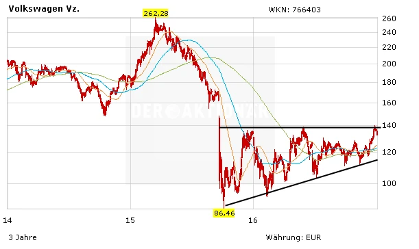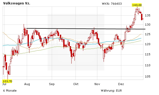 Was die Aktie von VW betrifft, so hat sich das Papier in den letzten Wochen dennoch deutlich erholt. Mit dem Überwinden der horizontalen Widerstandslinie bei 128 Euro hat VW ein Kaufsignal geliefert. Kurz vor dem Jahreswechsel geht dem Markt doch etwas die Puste aus. Deshalb hat das VW-Papier auch das Hoch aus dem Monat Mai 2016 bei 138 Euro nicht nachhaltig knacken können. Wird diese Hürde genommen, liefert die VW-Aktie ein neues Kaufsignal mit Raum bis 150 Euro. Nach unten warten die nächsten Unterstützungen bei 129,95 Euro und 128,50 Euro. Wer investiert ist, bleibt dabei.