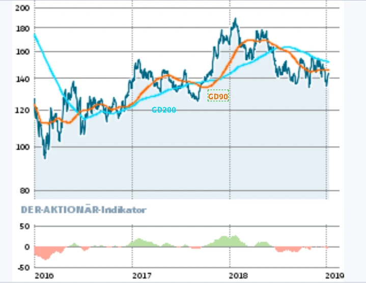 Volkswagen-Chef Herbert Diess hatte Mitte November Investitionen von 44 Milliarden Euro für Digitalisierung, autonomes Fahren und E-Mobilität in den kommenden fünf Jahren angekündigt. Die Strategie von VW ist richtig. Ein Kaufsignal entsteht bei der Aktie, sofern das Papier die 90-Tage-Linie bei 145,88 Euro überwindet. Die Position wird ausgebaut, wenn die wichtige 200-Tage-Linie bei 151,99 Euro geknackt wird. Stoppkurs 134,50 Euro.