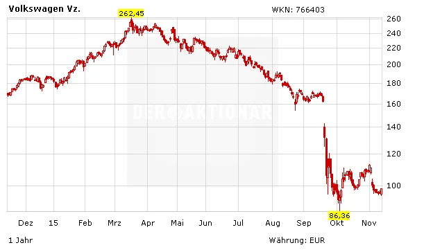 Die VW-Aktie ist zuletzt wieder unter die Marke von 100 Euro gefallen. Zwischen 90 und 98 Euro scheint sich aber eine Bodenbildung abzuzeichnen. Was bleibt ist die Unsicherheit rund um die Höhe des Schadens des ganzen Abgas-Skandals. Und die Börse hasst nichts mehr als Unsicherheit. Sicher hat in den letzten Tagen der große Abgabedruck nachgelassen. Große Sprünge sind von der Aktie kurzfristig allerdings nicht zu erwarten.