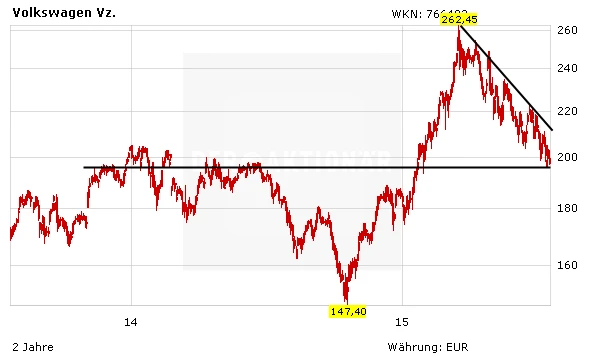 DER AKTIONÄR sieht Volkswagen derzeit noch als Halte-Empfehlung. Eine wichtige Unterstützung liegt bei 195 Euro. Ein Kaufsignal würde jedoch erst das Überwinden der oberen Begrenzung des Abwärtstrendkanals bei 208 Euro bringen.
