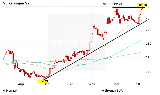 Die Aktie sieht ebenfalls spannend aus. Es bleibt dabei: Knackt das Papier die hartnäckige Widerstandszone um 179 Euro, ist der Weg bis 200 Euro plus X frei. Goldman Sachs hat sich erst vor wenigen Tagen besonders bullish für die VW-Aktie gezeigt. Analyst Stefan Burgstaller hält Kurse von 250 Euro für möglich.