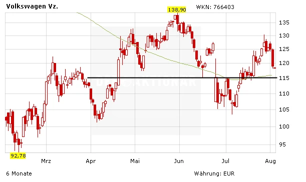 DER AKTIONÄR bleibt dabei: Das Schlimmste ist im Kurs längst eingepreist sein. Die Zahlen für das erste Halbjahr waren gut, die Aktie ist auf dem aktuellen Niveau weiterhin spekulativ kaufenswert. Auf Sicht von 12 bis 24 Monaten hat das Papier ein attraktives Chance-Risiko-Verhältnis. Mit nur kleinen Handgriffen kann das Management VW weiter auf Rendite trimmen.