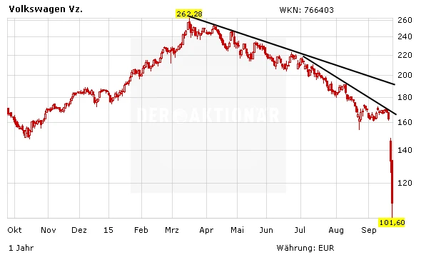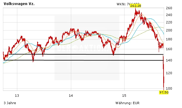 Auf VW wird in dne nächsten Wochen noch einiges zukommen: Schadensersatzklagen, Strafzahlungen in den USA usw. Alleine die Strafzahlung die von der US-Umweltbehörde EPA verhängt werden soll, soll 18 Milliarden Dollar betragen. Dennoch ist es gut möglich, dass VW mit einer weitaus geringeren Strafe als angenommen davon kommen könnte. Warum? Blickt man in die Vergangenheit, wurden auch andere große Player der Autobranche von Skandalen heimgesucht. GM zum Beispiel hatte defekte Zündschlösser verbaut, das hatte sogar mehrere Todesfälle zur Folge. GM musste 900 Millionen Dollar Strafe zahlen. Toyota kämpfte mit defekten Airbags des Zulieferers Takata. 6,5 Millionen Autos wurden zurückgeholt. Die VW-Aktie jedenfalls hat sich in den letzten beiden Tagen etwas stabilisiert.