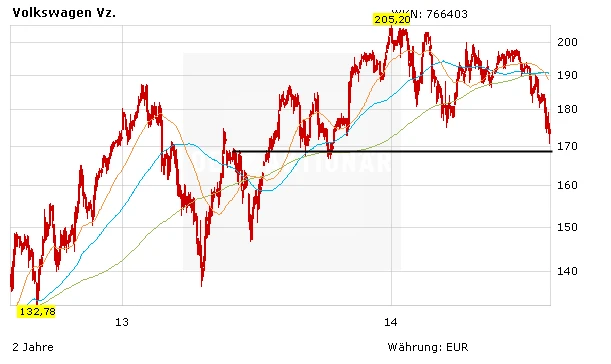 VW zumindest hat angekündigt, das Margenproblem angehen zu wollen. Immer wieder ist die Rede von fünf Milliarden Euro, die Vorstand Martin Winterkorn mit seinem Team einsparen will um das Renditeziel von sechs Prozent bis 2018 zu erreichen. Derweil bleibt die VW-Aktie weiterhin ein Langweiler. Die Seitwärtsbewegung läuft nun schon mehrere Monate. Dennoch: Investierte Anleger bleiben dabei. Positiv war, dass sich die VW-Aktie in den letzten Tagen bei dem Abverkauf an den Märkten gut behauptet hat.