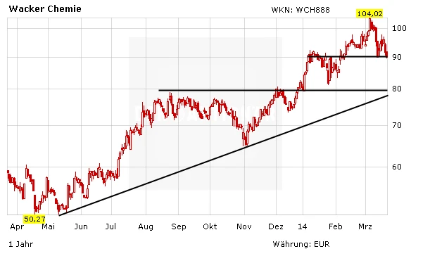 Stabilisieren sich die Polysilizium-Preise weiterhin, dürfte die zuletzt gezeigte Zuversicht von Wacker-Chef Rudolf Staudigl begründet sein. Dank des guten Ausblicks für das laufende Jahr sollte die MDAX-Aktie nicht nachhaltig unter die 90-Euro-Marke fallen. Trader, die auf einen Anstieg in Richtung des Jahreshochs spekulieren, sollten ihre Position mit einem engen Stopp bei 85,00 Euro abgesichern.