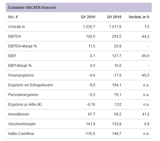 Auch wenn von den von vielen Marktbeobachtern erwarteten Preisverbesserungen im Auftaktquartal noch nichts zu spüren war, setzt der Vorstand auf eine Belebung des Polysilizium-Geschäfts im zweiten Halbjahr. Daher hält er auch an der Anfang März gesenkten Jahresprognose fest. Der Konzernumsatz soll im Gesamtjahr um einen mittleren einstelligen Prozentsatz wachsen (Vorjahr: 4,98 Milliarden Euro). Das EBITDA wird voraussichtlich um zehn bis 20 Prozent fallen nach 930 Millionen Euro im Vorjahr. Auf Basis der Prognose könnte das EBITDA im laufenden Jahr im schlimmsten Fall von 930 Millionen in 2018 auf 744 Millionen Euro fallen. Die obere Begrenzung der Prognosespanne sieht einen Wert von 837 Millionen Euro vor.
