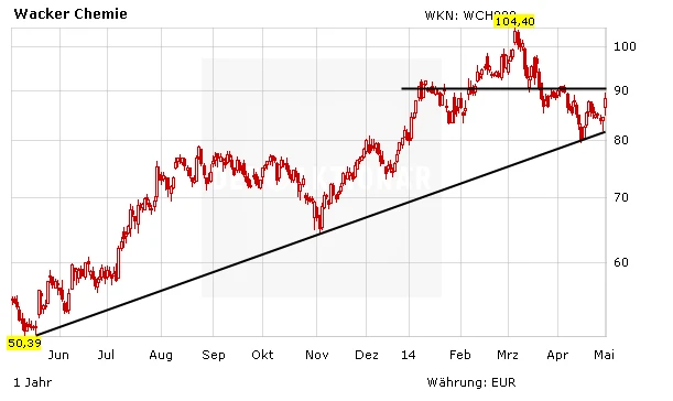 Der Gewinn stieg im ersten Quartal auf 64,2 Millionen Euro, nach 5,1 Millionen Euro im Vorjahreszeitraum. Dabei profitierte Wacker Chemie auch von hohen Sonderzahlungen im Zusammenhang mit der Auflösung von Verträgen für Solarsilizium. Der Umsatz kletterte trotz des Preisdrucks bei einigen Produkten und der Schwäche des US-Dollar und des japanischen Yen um 7,5 Prozent auf 1,16 Milliarden Euro.