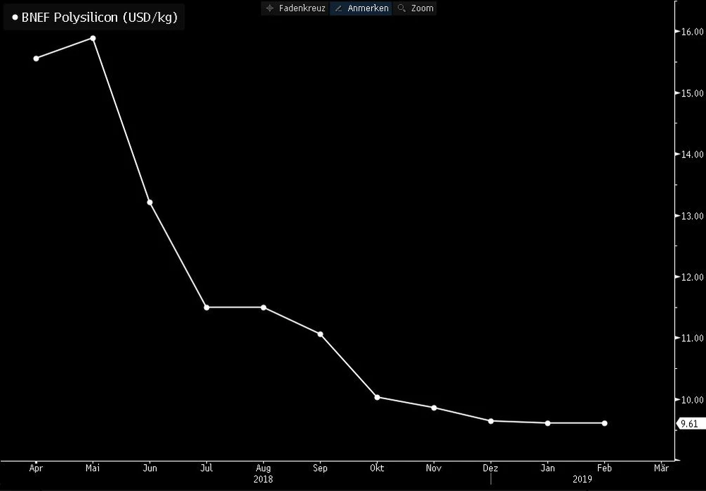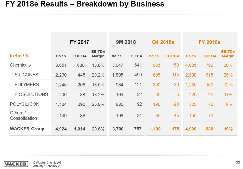 Das Polysilizium-Geschäft steht bei Wacker Chemie im Fokus. Im laufenden Jahr rechnet der Münchner Konzern auf der einen Seite mit einem Umsatzplus dank einem höheren Absatz von Polysilizium. Auf der anderen Seite ist mit einem EBITDA-Rückgang um zehn bis 20 Prozent zu rechnen – wegen voraussichtlich niedrigerer Durchschnittspreise für Polysilizium. Allerdings sind erstmals seit langem in diesen Tagen die Spotpreise für den wichtigen Rohstoff gestiegen. Ist dieser Trend von Dauer, könnten die Gewinnprognosen zu niedrig angesetzt sein. Doch es gibt noch einen anderen Aspekt.
