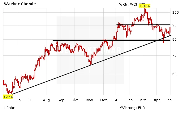 Die Stabilisation der Polysilizium-Preise ist für Wacker Chemie ein wichtiger Punkt. Diese Informationen sind jedoch bereits zum größten Teil eingepreist. Langfristige Anleger warten vorerst ab. Trader können erneut auf einen Anstieg in Richtung das Jahreshochs spekulieren, müssen jedoch bedenken, dass gefährliche Rücksetzer drohen, wenn der langfristige Aufwärtstrend durchbrochen wird.