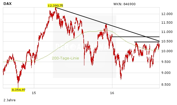 Der deutsche Leitindex ist am Freitag mit 10.367 Punkten aus dem Handel gegangen, etwas höher als beim Zwischenhoch vom 31. Mai. Folglich fehlen gerade einmal rund 100 Punkte bis zu den Hochs vom 18. April und 1. August. Nicht minder wichtig aus charttechnischer Sicht ist die seit April 2015 gültige Abwärtstrendlinie, die bei rund 10.500 Zählern verläuft.