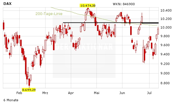 Dass der DAX kurz Luft holt, ist aber nach einem Sprung um 600 Punkte völlig normal. Von Überhitzung ist dennoch keine Spur. Der Relative-Stärke-Index bewegt sich noch im normalen Bereich, MACD und Directional Movement Indikator haben erst ein Kaufsignal geliefert und noch reichlich Luft nach oben. Aus technischer Sicht spricht somit vieles dafür, dass der DAX auch die 200-Tage-Linie zurückerobert und den jüngsten Aufwärtstrend fortsetzt.