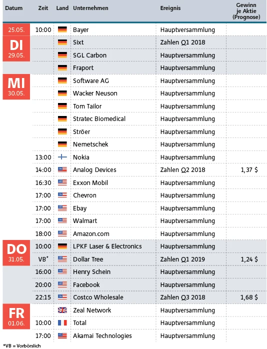 Der Terminkalender ist auch in der kommenden Woche prall gefüllt. Sowohl im deutschen Nebenwertebereich als auch bei den amerikanischen Blue Chips stehen spannende Hauptversammlungen an. Bei Walmart steht der Wandel vom klassischen Supermarktgeschäft zum Online-Handel im Mittelpunkt.