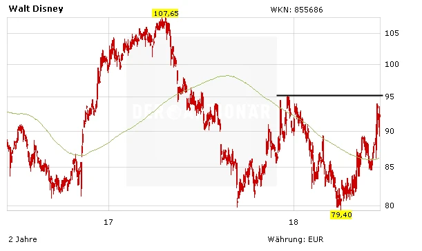 Der Sieger des Übernahmekampfs heißt Fox. Seit der Empfehlung des AKTIONÄR liegt die Aktie 80 Prozent im Plus. Auch Disney ist weiterhin interessant: Die Aktie nimmt wieder Kurs auf den Widerstand bei 95 Euro. Darüber wäre der Weg praktisch frei Richtung 2017er-Hoch bei 107,65 Euro. Danach wartet als nächstes Ziel das Allzeithoch bei 113 Euro (bzw. 120 Dollar). Disney ist mit einem aktuellen KGV von 14,6 nach wie vor billig und mit oder ohne Fox-Assets ein Kauf.