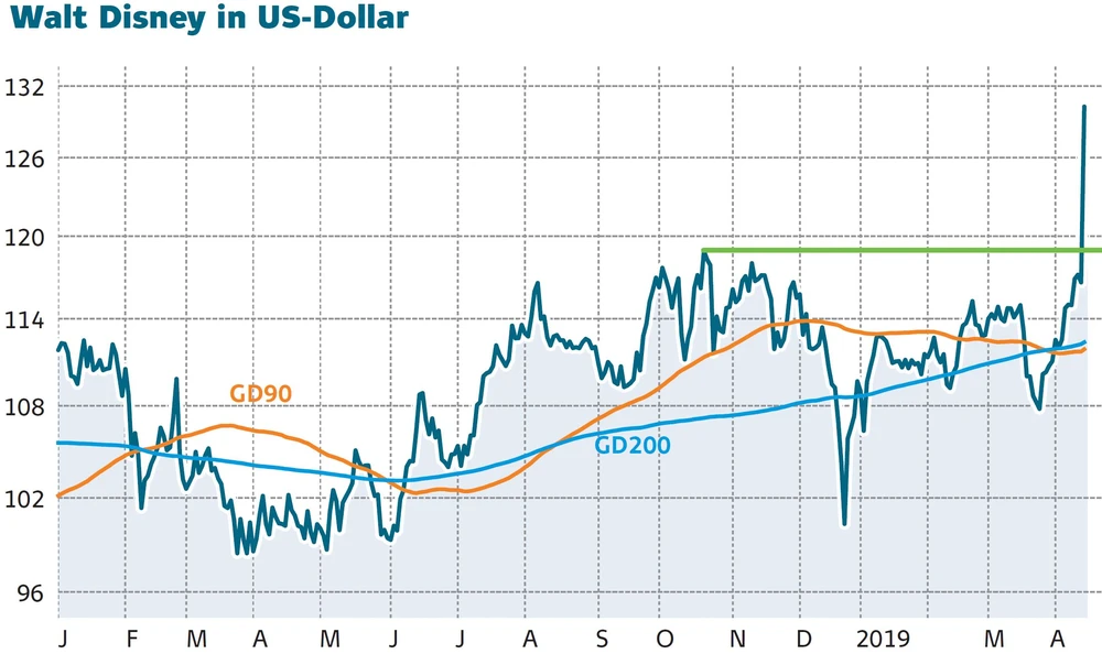 Knapp vier Jahre hing die Disney-Aktie im Seitwärtstrend fest. Nun das: Am Freitag schoss das Papier durch die Decke, gewann 11,5 Prozent auf 130 Dollar und markierte ein neues Rekordhoch. Erweist sich der Ausbruch als nachhaltig, bedeutet dies ein ganz starkes Kaufsignal.