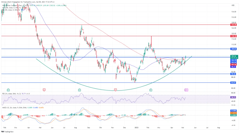 Auch das Chartbild von Disney kann sich sehen lassen. Nach dem Verlaufstief im Dezember bei 84,07 Dollar markierte die Aktie im März bei 90,46 Dollar ein höheres Hoch, was auf eine Trendwende hindeutet. Zudem erzeugte Disney durch den Kurssprung am Montag ein Kaufsignal, indem der Kurs über die Hochs aus dem März und dem April bei 102,70 respektive 102,56 Dollar sprang. Damit ist der Weg bis zum November-Hoch bei 108,84 Dollar frei. Sollte der die Disney-Aktie auch diesen Widerstand überwinden, wartet sogar schon das Jahreshoch bei 118,18 Dollar.