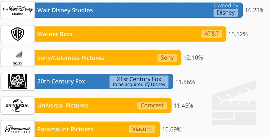 Die Basis für weitere starke Jahre hat Disney mit der Übernahme von 20th Century Fox gelegt. Wie eine Analyse von Statista zeigt, kommen die beiden Studios seit 1995 auf einen Marktanteil in Nordamerika von 28 Prozent – und sind damit klare Nummer 1.
