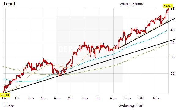 Zudem ist die Wachstumsstory von Leoni intakt: Bis 2016 soll der Umsatz des Autozulieferers von derzeit 3,8 auf 5,0 Milliarden Euro steigen. Gleichzeitig wird sich das EBIT mehr als verdoppeln. Von 170 auf 350 Millionen Euro.