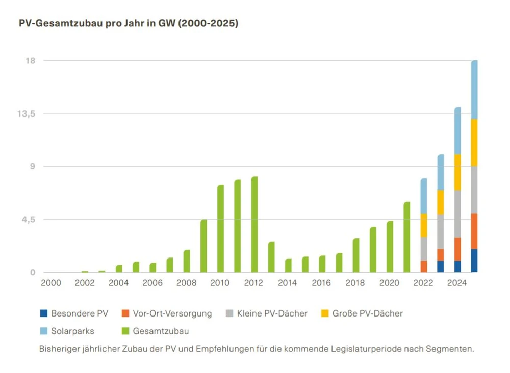 Konkret: „Den Zubau der Photovoltaik auf jährlich über 10 Gigawatt erhöhen. Das ist das Ziel.“ Denn die Verdrängung fossiler Energieträger zum Zwecke des Klimaschutzes sowie die Elektrifizierung der anderen Sektoren, seien große Treiber. „Dies wird den Stromverbrauch in Deutschland und Europa massiv erhöhen. Es liegt also auf der Hand, dass der Zubau der Wind- und Solarenergie in diesem Jahrzehnt deutlich angehoben werden muss.“ Argument: „PV-Freilandanlagen benötigen auch im Vergleich zur Bioenergieerzeugung ungleich weniger Fläche. Und mit PV-Dachanlagen können zudem zusätzliche Synergien bei der Dekarbonisierung des Wärme- und Mobilitätssektors gehoben werden.“