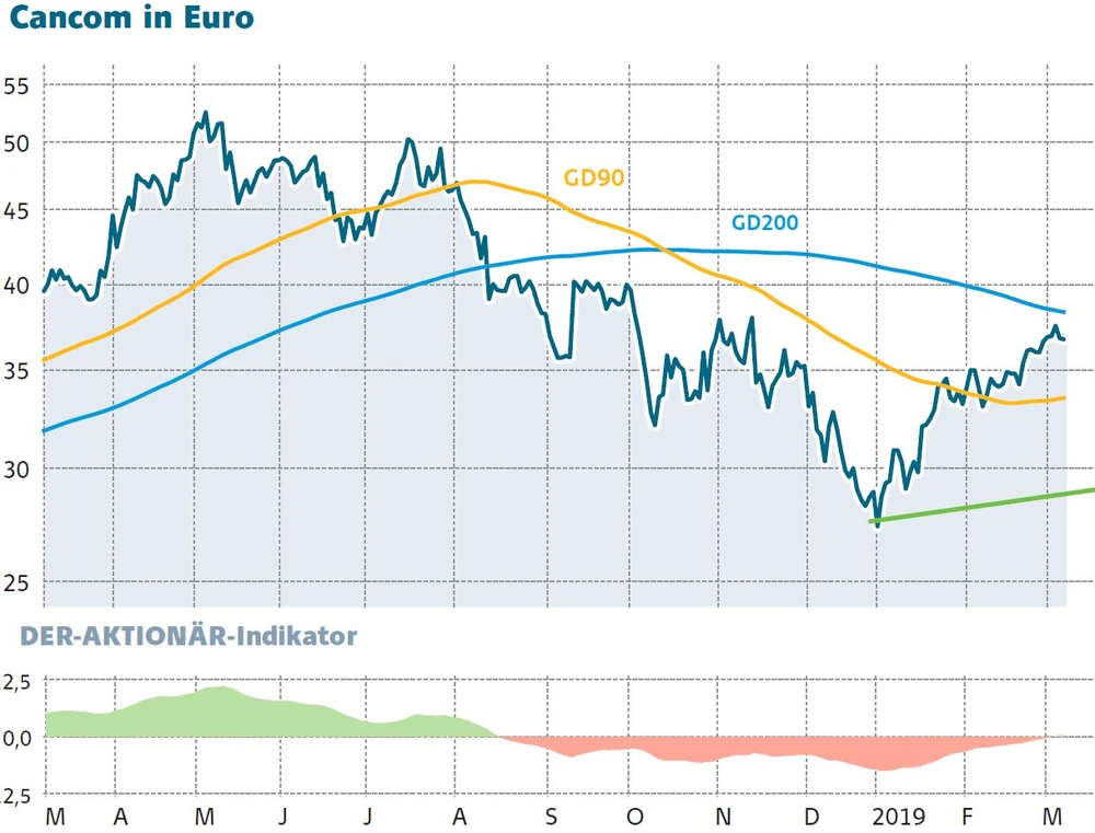 Ein Blick auf die Cancom-Aktie zeigt, dass sich das starke Umsatzwachstum und die Stärkung der EBITDA-Marge positiv auf den Kurs auswirkt. Nach der Verschnaufpause 2018 besitzt die Aktie 2019 wieder Trendstärke. Das KGV für die nächsten 12 ist von 33 im April 2018 auf aktuell 22 geschrumpft. Die Aktie steht zudem kurz vor der 200-Tage-Linie. Anleger schlagen nicht ohne Kaufsignal zu sondern setzen Cancom auf die Watchlist.