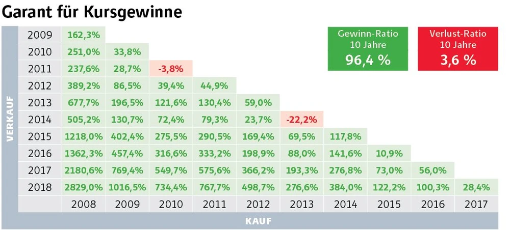 Nicht, dass das die Aktie bislang gebremst hätte, wie die Performance-Grafik beweist: Wer vor zehn Jahren eingestiegen ist, freute sich Ende des vergangenen Jahres über eine sensationelle Performance von 2.829 Prozent.