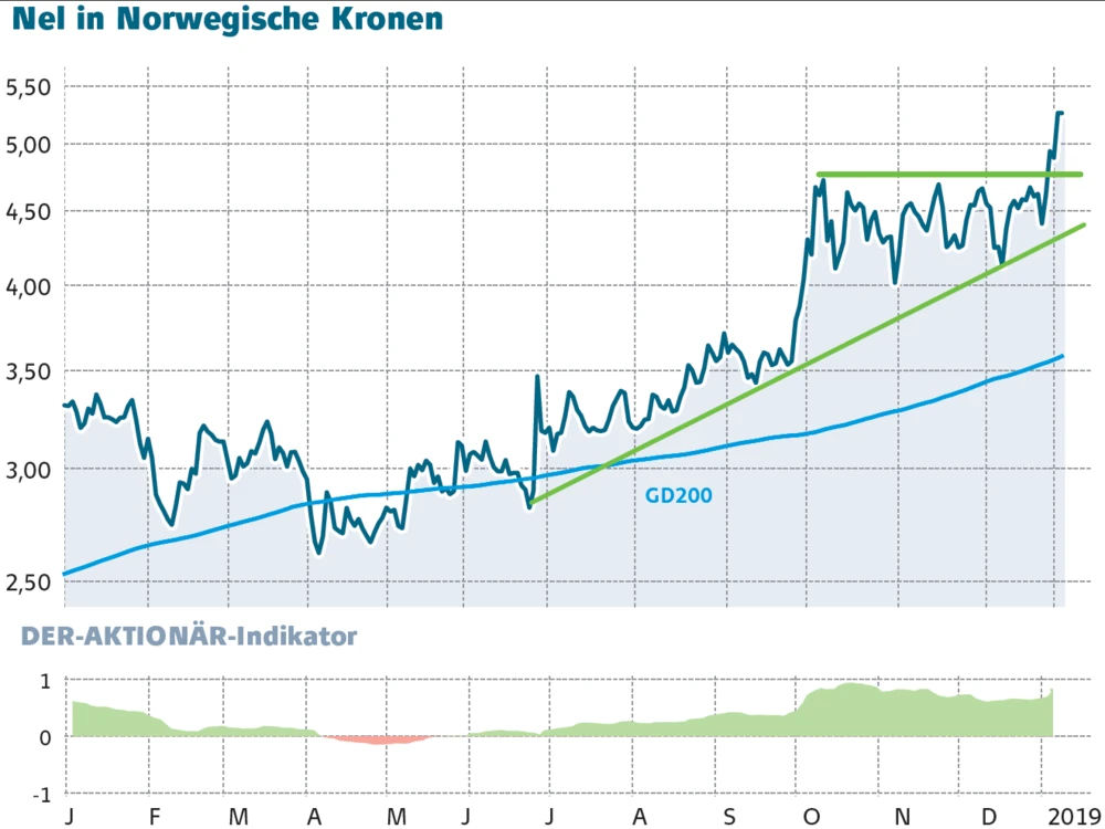 Bei all den grandiosen Zukunftsaussichten in puncto Elektrolyse, Wasserstofftankstellen und Power-to-Gas-Projekten: Nel wird mittlerweile mit über 600 Millionen Euro an der Börse bewertet, der Mega-Deal mit Nikola Motor darf keineswegs ins Wasser fallen. Denn davon sind schon einige Vorschusslorbeeren eingepreist. Einen Teilgewinn zu realisieren, sollte nicht schaden. Die Aufstockung der spekulativen Position bietet sich idealtypisch am Ausbruchsniveau bei 4,70 Kronen an.