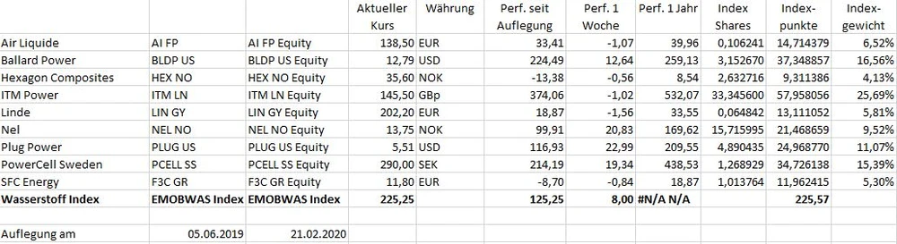 Seit Auflegung konnten sieben der neun verbliebenen Mitglieder (das ehemalige Mitglied Hydrogenics wurde übernommen) deutliche Zugewinne verbuchen. Lediglich Hexagon Composites und die deutsche SFC Energy hinken der fulminanten Entwicklung von Ballard Power, ITM Power und Co hinterher.