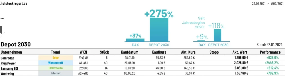 Unsere Strategie im Depot 2030 des AKTIONÄR Hot Stock Report: Wir lassen bei unserem Highflyer Plug Power nach Gewinnmitnahmen die Restposition (+2.500 Prozent) laufen, doch setzen mit Hyundai wieder auf eine aktuell noch unterschätzte Aktie. Zudem stehen wir kurz vor einer weiteren Neuaufnahme im grünen Depot 2030, das selbst im kniffligen Jahr 2020 rund 100 Prozent Plus für seine Leser erzielen konnte. Gerne hier freischalten und ab 2021 mit uns den Weg in Richtung 2030 gehen.