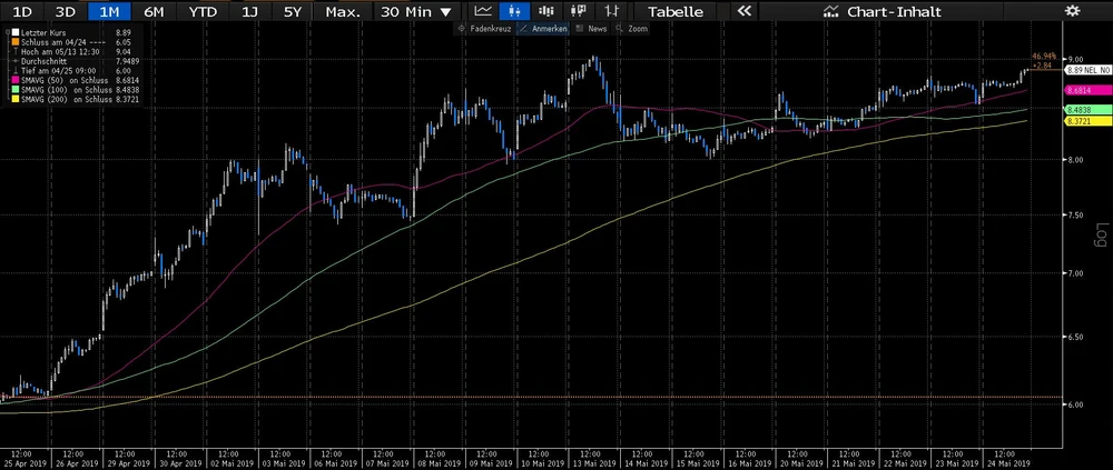 Am Freitag scheint die Nel-Aktie erneut einen Angriff auf das bisherige Rekordhoch bei 9,04 Kronen zu starten. Das Kursplus im zurückliegenden Monat beläuft sich auf etwa 47 Prozent. Und das in der schwierigen Marktphase.