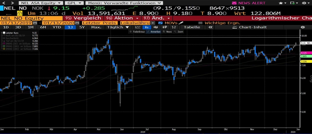 Denn mit dem Kurssprung von gut drei Prozent an der Heimatbörse in Oslo räumt die Nel-Aktie das November-Hoch bei 8,91 Kronen endgültig aus dem Weg. Nun gilt es, das Kaufsignal auch auf Schlusskursbasis zu bestätigen.