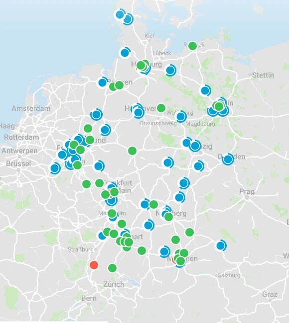 Wasserstoff-Tankstellen: Grüner Punkt = in Betrieb, blauer Punkt = in Planung/Realisierung; Quelle: H2 Live