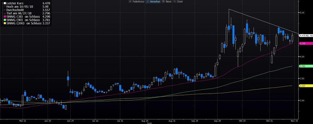 Im gestrigen Handel konnte die Nel-Aktie nach den Tweets von Nikola Motor um gut zwei Prozent zulegen. Einmal mehr hat sich die 38-Tage-Linie als Unterstützung erwiesen. Nun steht das spekulative Papier unmittelbar vor dem Ausbruch aus dem mittelfristigen Abwärtstrend.