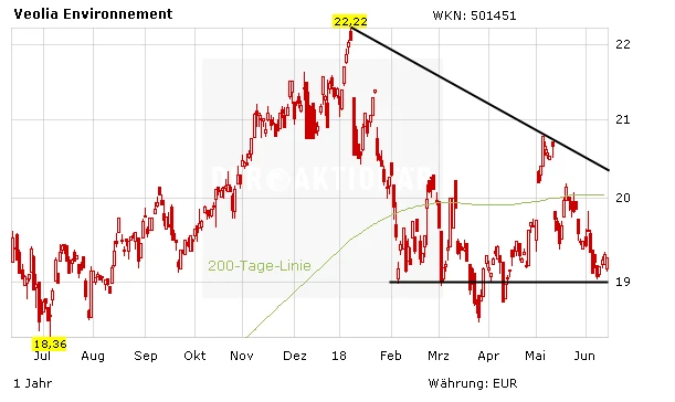Auch der Abfallentsorger Veolia überzeugte mit einem soliden Jahreauftakt. Im ersten Quartal konnte Veolia ein Umsatzplus von 3,7 Prozent auf 6,4 Milliarden Euro verzeichnen. Einen Großteil des Wachstums verdankt der französische Konzern den aussichtsreichen Geschäftsbereichen Plastik- und Chemikalien-Recycling sowie der Energie-Erzeugung aus Abfall. Mittlerweile hat die Aktie einen Rücksetzer hinnehmen müssen. Für langfristig ausgerichtete, konservative Anleger eine gute Gelegenheit bei den Franzosen einzusteigen. On top lockt eine Dividendenrendite von aktuell 4,3 Prozent.