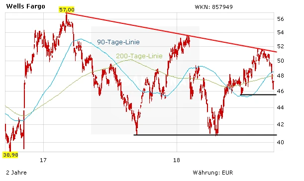 An der Börse geriet der S&P-500-Wert zuletzt etwas deutlicher unter Druck. Der Wells-Fargo-Kurs rutschte auch wieder unter die 200-Tage-Linie. Bis auf weiteres sollten Anleger die Finger von der US-Bank lassen und eine Stabilisierung des Geschäfts abwarten.