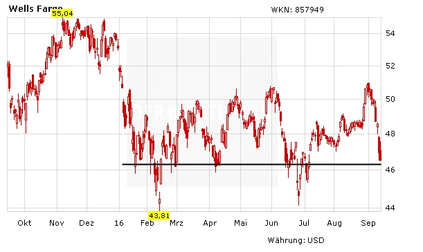 Der Skandal um Schein-Konten für Kunden lastet weiter schwer auf den Papieren von Wells Fargo. Fundamental steht die Bank gut da, charttechnisch wird die Situation dagegen ungemütlich.