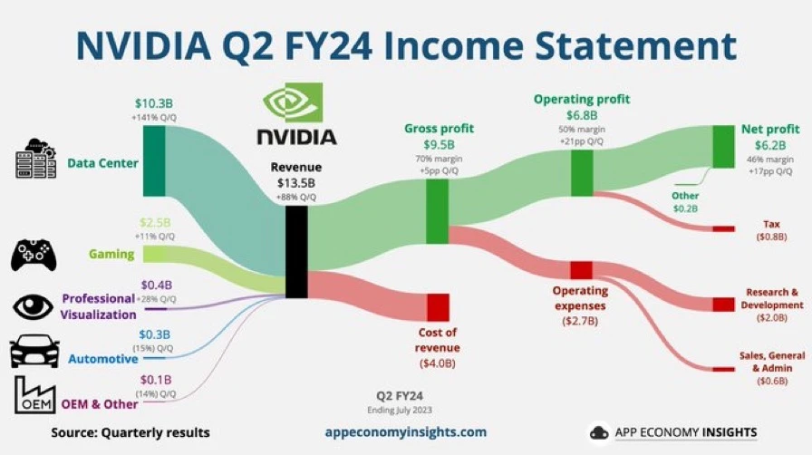Auch Elon Musk überweist Geld an Nvidia. Im Juli-Analystencall gab es ein regelrechtes Loblied von Elon Musk auf Nvidia und den „ausgezeichneten Job“, den CEO Jensen Huang mache. Tesla kauft offenbar in großen Mengen Nvidia-GPUs, sofern sie aufgrund der hohen Nachfrage lieferbar sind.