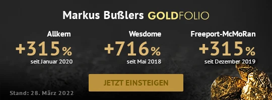 Um seinen Lesern die kommenden Highflyer stets vor allen anderen zu präsentieren, setzt Markus Bußler bei seiner Suche nach Hochkarätern auf seine exzellenten Kontakte zum Management der empfohlenen Unternehmen und macht sich gern persönlich ein Bild von der Lage vor Ort. Diese intensive Recherche zahlt sich aus: So hat Bußler mit Yamana Gold seit dem Kauf in das Goldfolio-Depot im April 2019, ein Plus von 153 Prozent (Stand 28.03.2022) erzielt. Und Wesdome Gold, aufgenommen im Mai 2018, steht bereits bei plus 716 Prozent (Stand 28.03.2022).